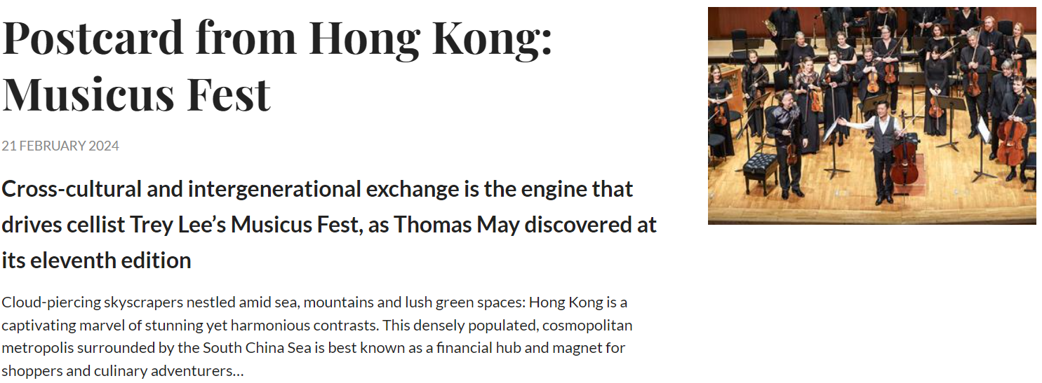 US music writer Thomas May attended Musicus Fest 2023, where he interviewed Artistic Director Trey Lee, guest pianist Louis Lortie and members of Musicus Soloists Hong Kong. The feature story in The Strad outlines Trey's artistic vision and the story behind Musicus Society, while also introducing our international musical partnerships and how we promote young players as cultural ambassadors of Hong Kong.