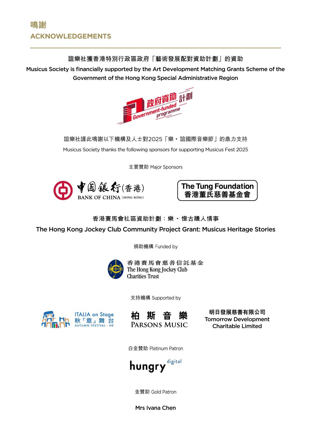 誼樂社舉辦的音樂會及教育項目,致力透過跨文化合作推廣音樂及其教育。我們與領先企業建立了長期合作關係。我們提供一系列企業夥伴方案,讓品牌與我們的觀眾,包括香港傑出名人、專業人士、文化界人士等,有更全面的接觸。您的贊助方案可按需要度身訂做,以達致最大的市場推廣效果。